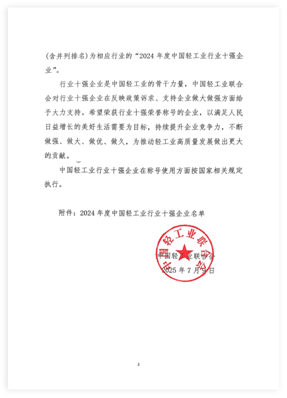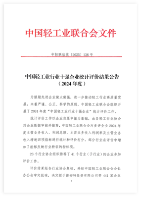 2025年7月9日,中國輕工業聯合會發布《中國輕工業行業十強企業統計評價結果公告》(中輕聯信統(2025)136號),發布了我國輕工業各行業的“2024年度中國輕工業行業十強企業”名單。